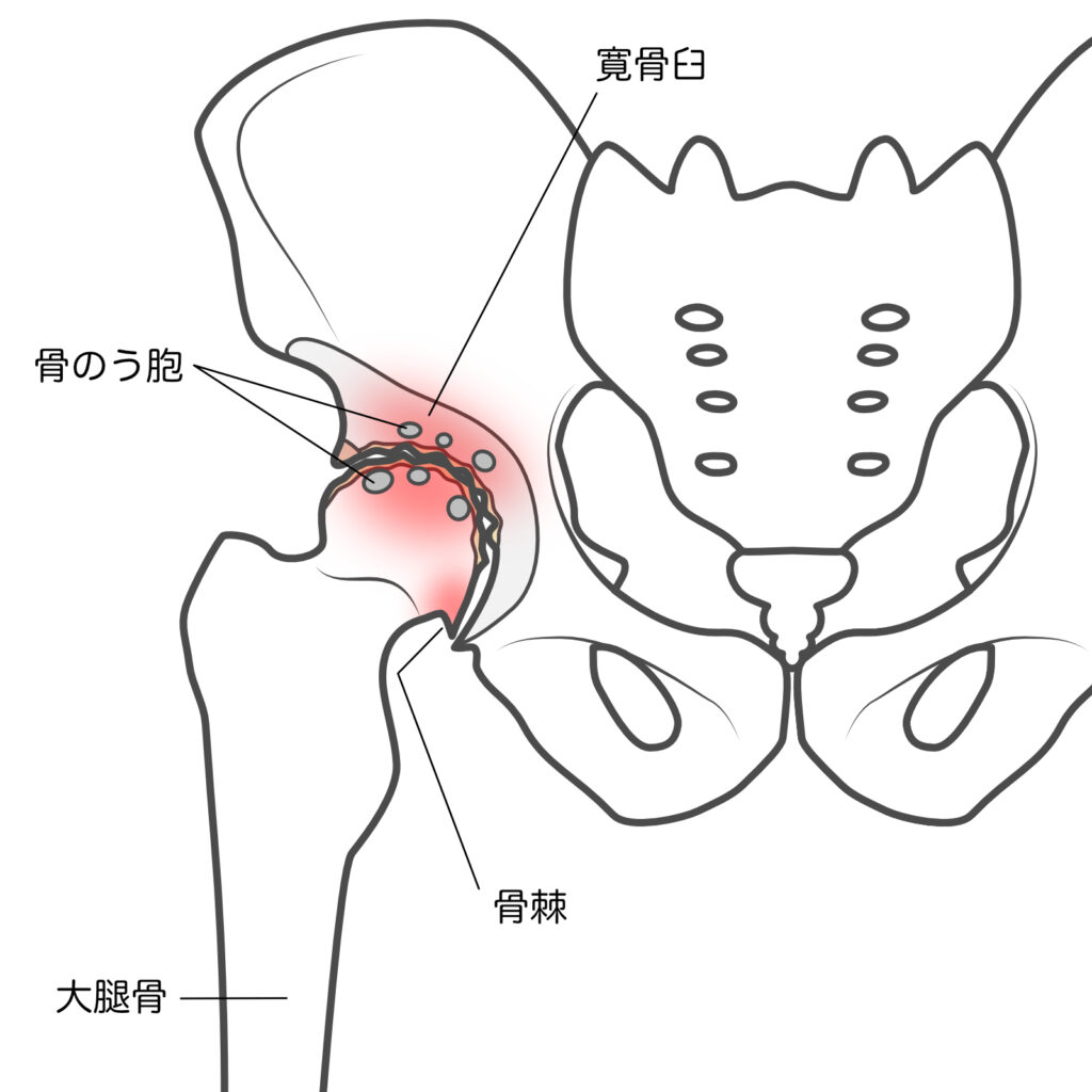 変形性股関節症は、関節軟骨の変性や摩耗により関節の破壊が生じ、これに対する反応性の骨増殖(骨硬化、骨棘)を特徴とする疾患で、